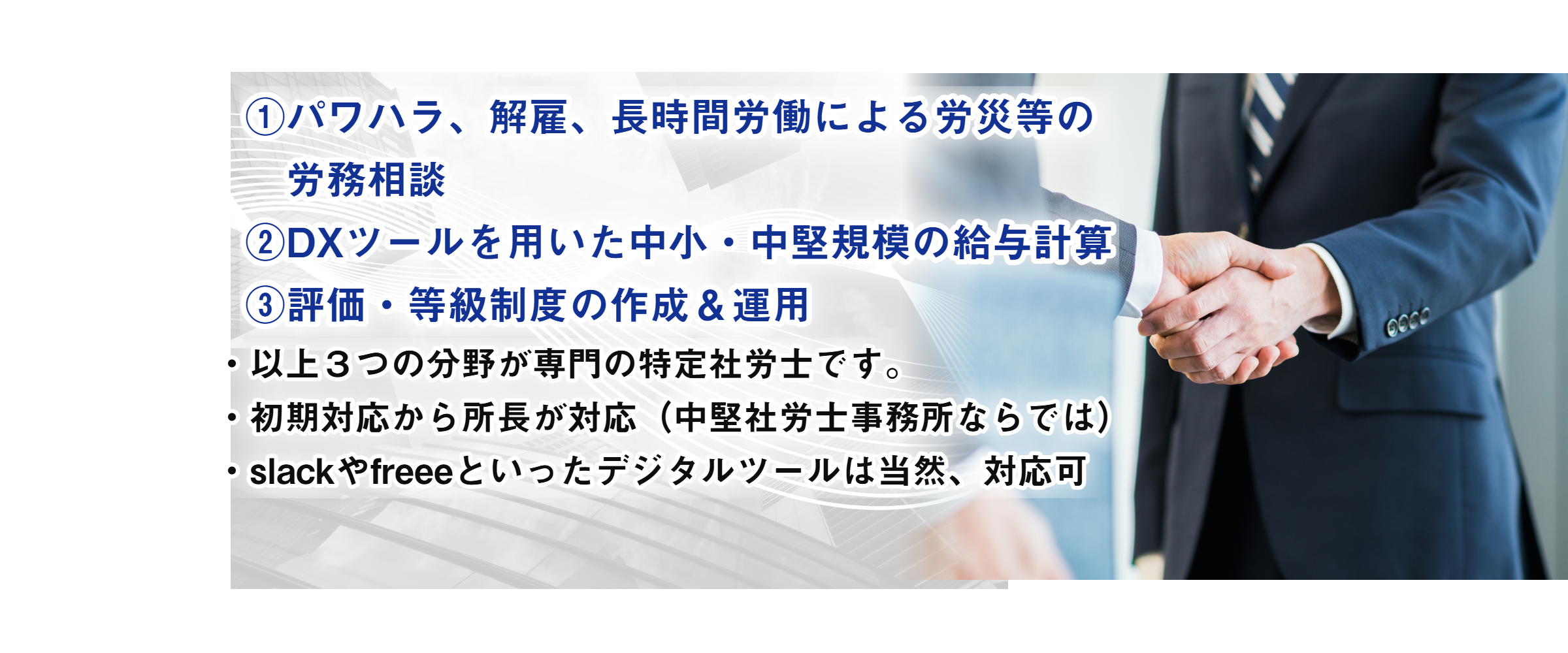 100~500人規模の中堅企業を最も得意としています。今後IPOを目指すフェーズの会社における労務監査(DD)並びに労務監査後に顕在化した未払賃金・長時間労働・労働紛争といた簿外債務のリスクを徹底的にクリアにします。